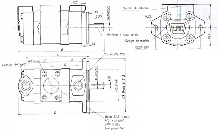 Las bombas LMC serie 20 20, son del tipo a paletas, construcción balanceada hidráulicamente, desplazamiento fijo, drenaje interno. Se pueden usar con varios tipos de fluídos y con motores de velocidad fija o variable.