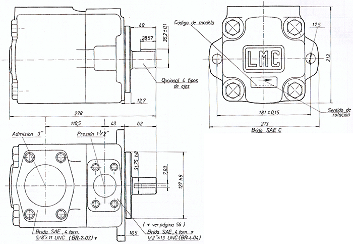 Pumps LMC series 45, are of type to vanes balanced construction, fixed displacement, internal drainage to replaceable cartridge of high performance; quieter in the series with normal lateral surfaces and more capacity of pressure and speed in series VQ.