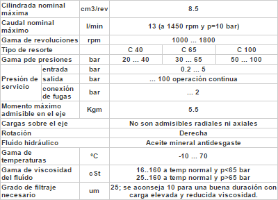 Este tipo de bombas a palhetas de cilíndrada variável possui um reduzido nível sonoro e uma grande segurança no serviço por purgado automático. Sua elevada duração se da graças aos cojinetes hidrodinámicos e às superfícies laterais de bronze de liga de metais especiais, o que lhe outorga excelentes caraterísticas de deslocamento Sua função é gerar um volume e imprimir-lhe só a energia necessária, reduzindo as perdas da mesma e o aquecimento do fluído. Para imitar o volume máximo se previu um regulador.